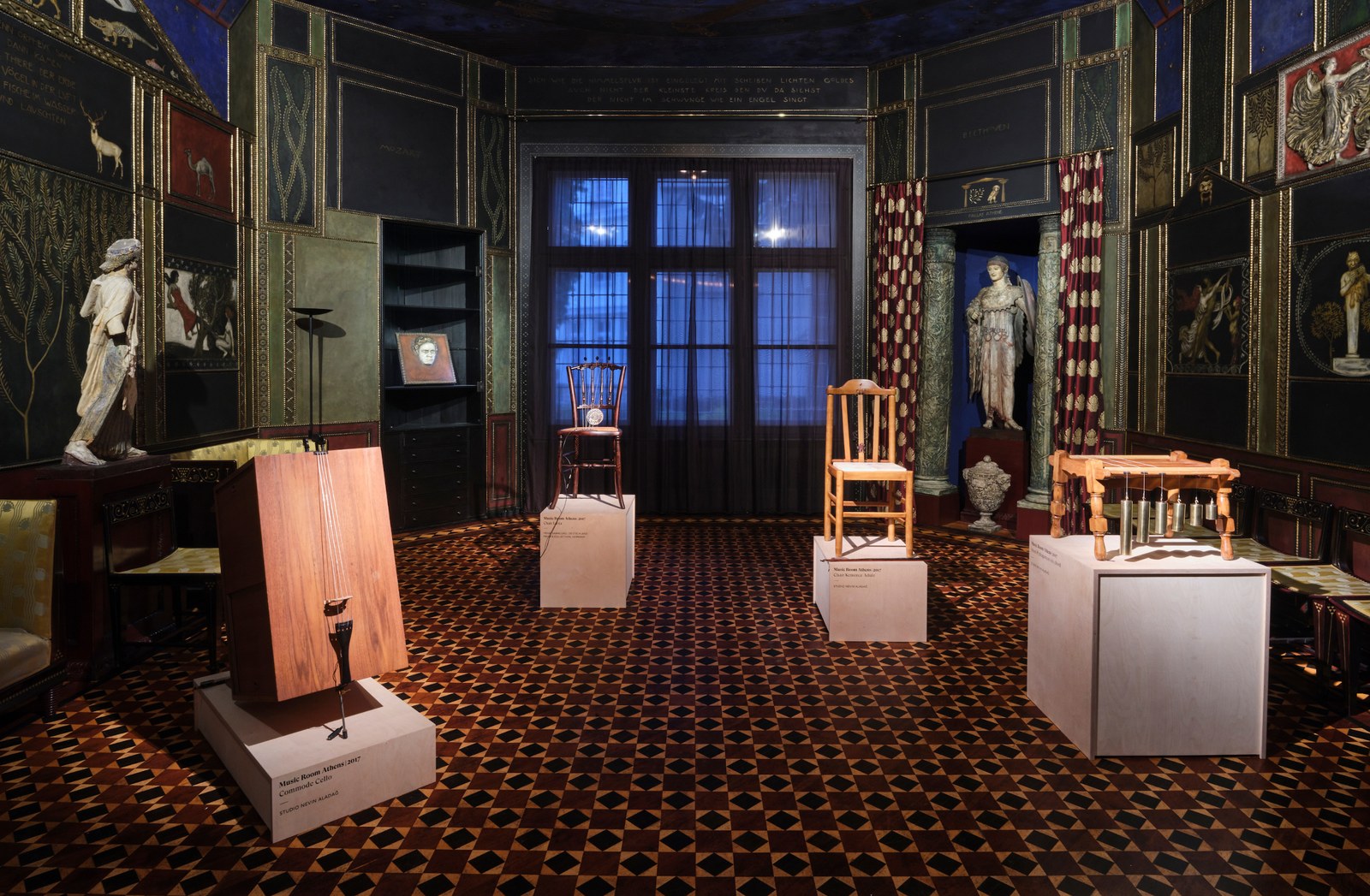 Der Rundgang im Innenbereich beginnt in den Räumen Franz von Stucks. Leise fügen sich dort einzelne Möbel in das historische Ambiente ein, die erst auf den zweiten Blick als die hybride Mischwesen aus Aladağs „Music Rooms“ (2014–2017) erkannt werden. Die Künstlerin hat Möbelstücke und Alltagsgegenstände, die sie auf Flohmärkten gezielt für ihren Zweck sucht, zu Instrumenten umbauen lassen. Bei der Auswahl ist ihr wichtig, dass es sich um Objekte handelt, die in jedem Wohnraum stehen könnten, dennoch sollten Form und Material akustischen Anforderungen ebenso genügen. Für die VILLA STUCK hat Aladağ eine goldene „Frame Harp“ entwickelt, die Stucks Gemälden mit musikalischem Sujet gegenübersteht. In der Mitte der Raumabfolge steht „Music Room Brussels“, ein komplettes Ensemble, das in monatlichen Performances durch Musiker*innen aktiviert wird.